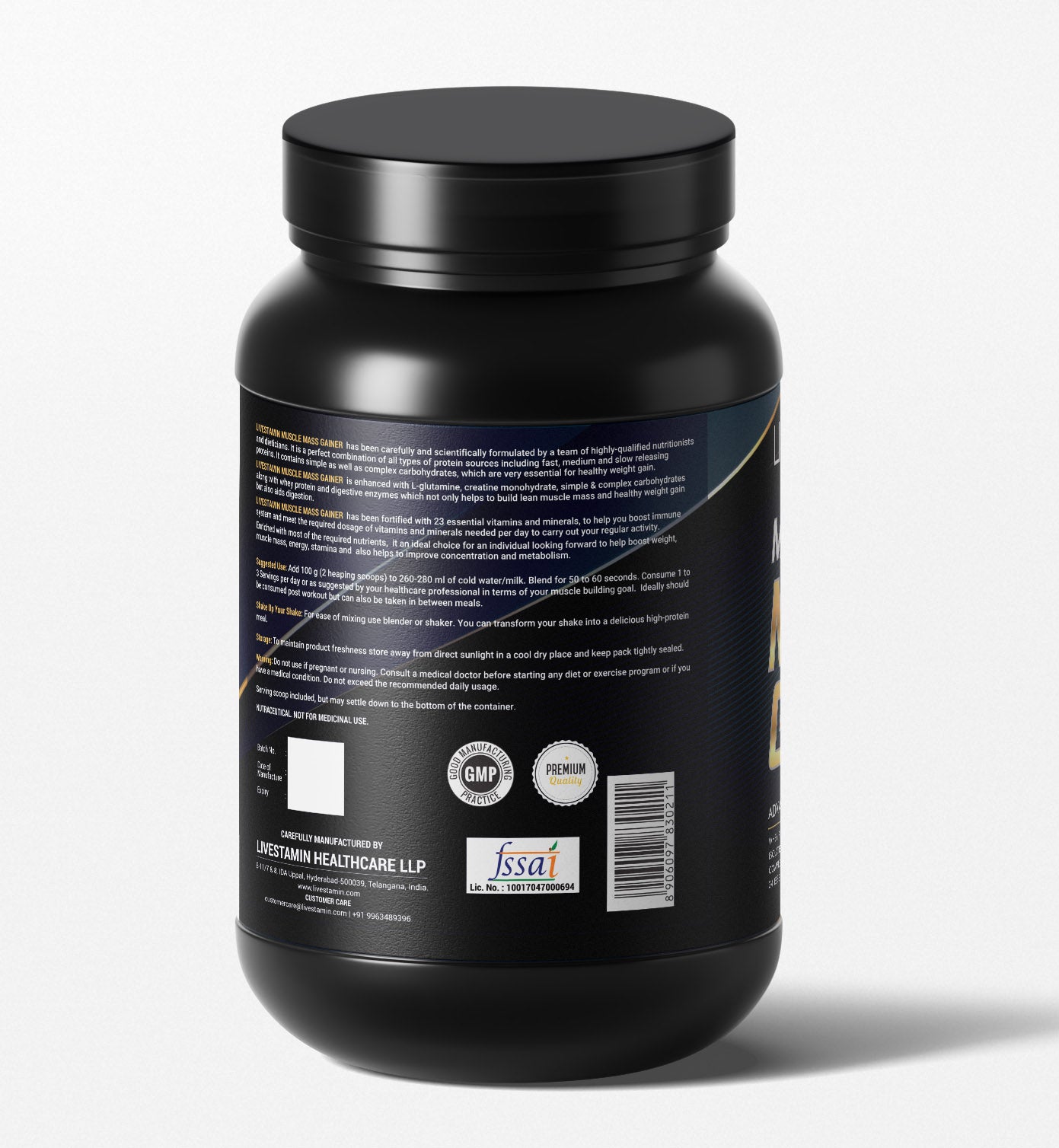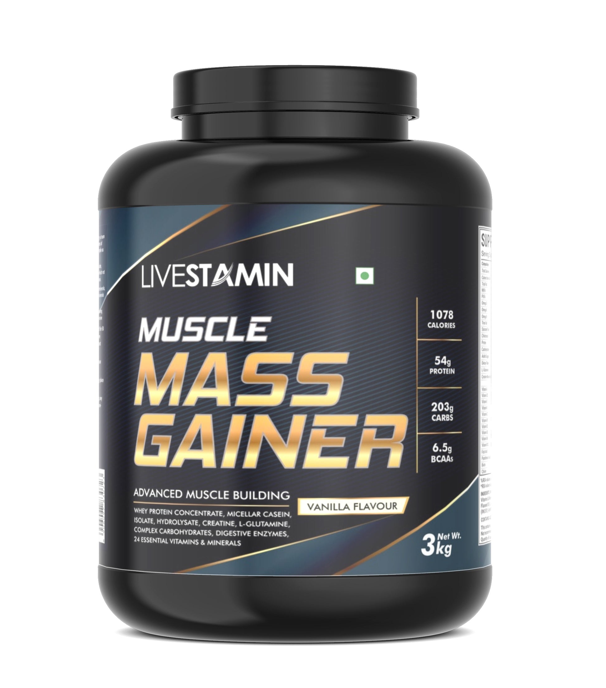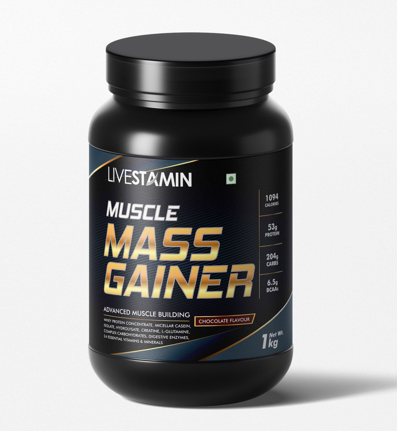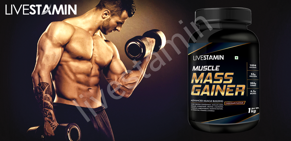 LIVESTAMIN Muscle mass gainer makes a delicious shake containing 365 calories and 17 grams of protein in 100 g when mixed with water/milk.