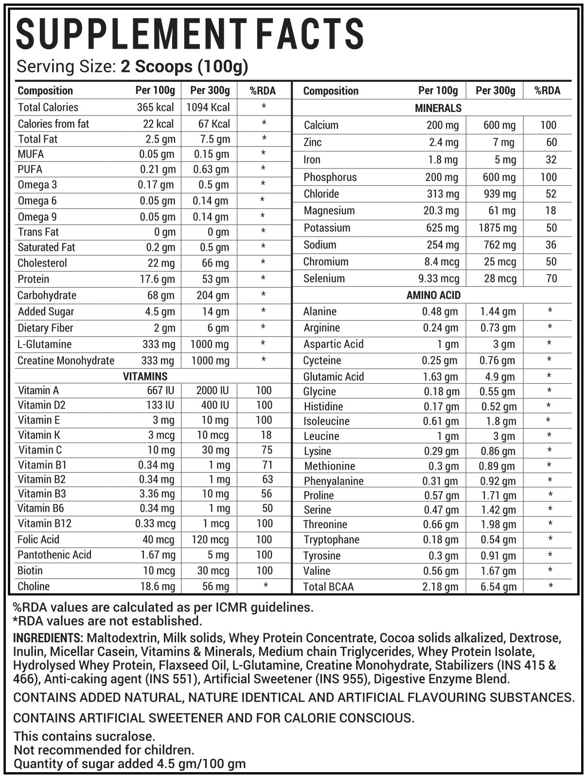 Mass gainer is enriched with complex carbohydrates, creatine monohydrate, 23 essentials vitamins & minerals, amino acids, and digestive enzymes for better absorption and easy digestion.