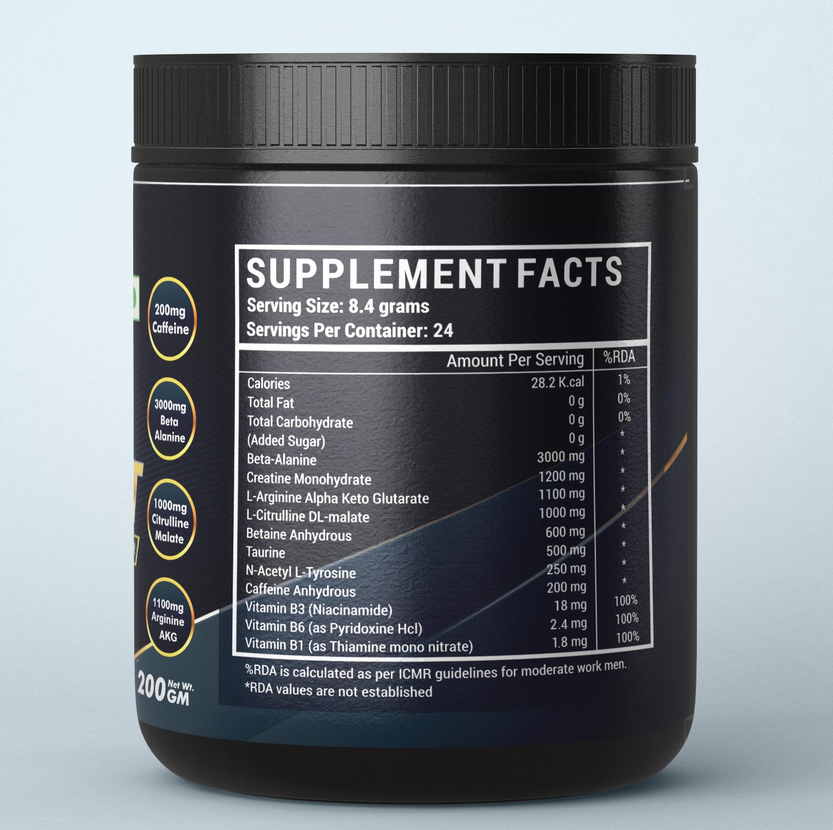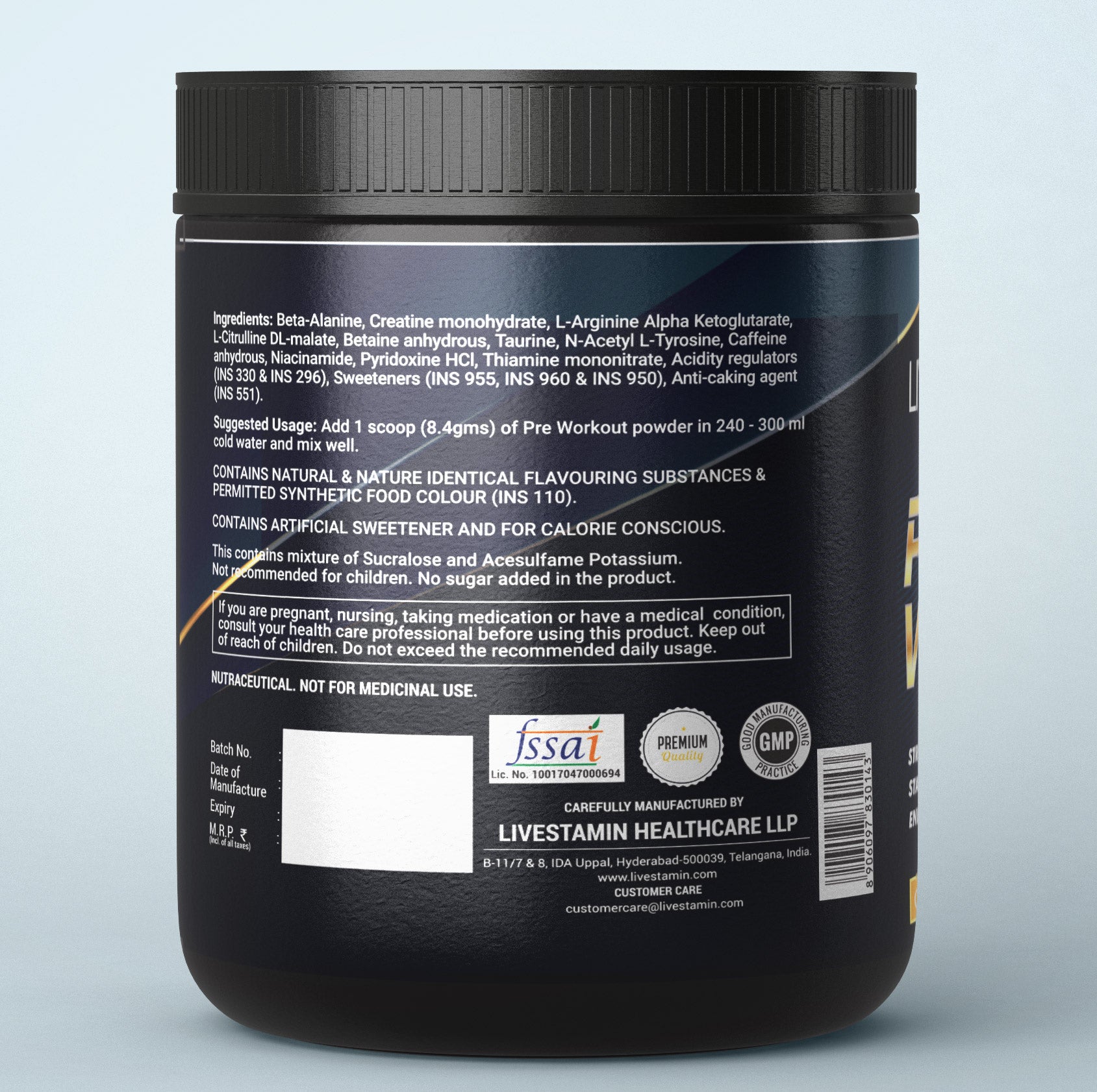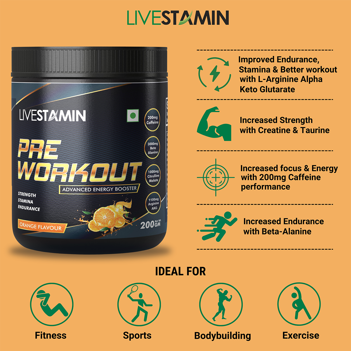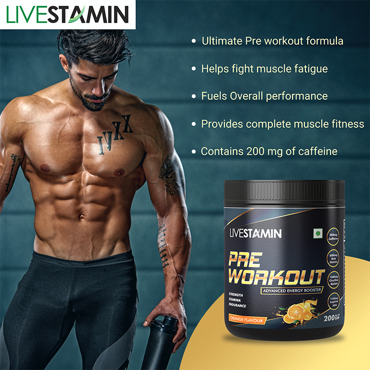 LIVESTAMIN Pre Workout powder is a powerful pack of ingredients like Caffeine, beta alanine, citrulline malate and arginine (AAKG) which helps a person to build stamina, strength and give them proper amount of pump required to get their desired outcomes. This powder is specially designed to help athletes & gym goers in muscle building, injury recoveries as well as aids in nerve stimulation. It also helps in preventing cramps caused during workout and provide energy to perform better and boost endurance power.
