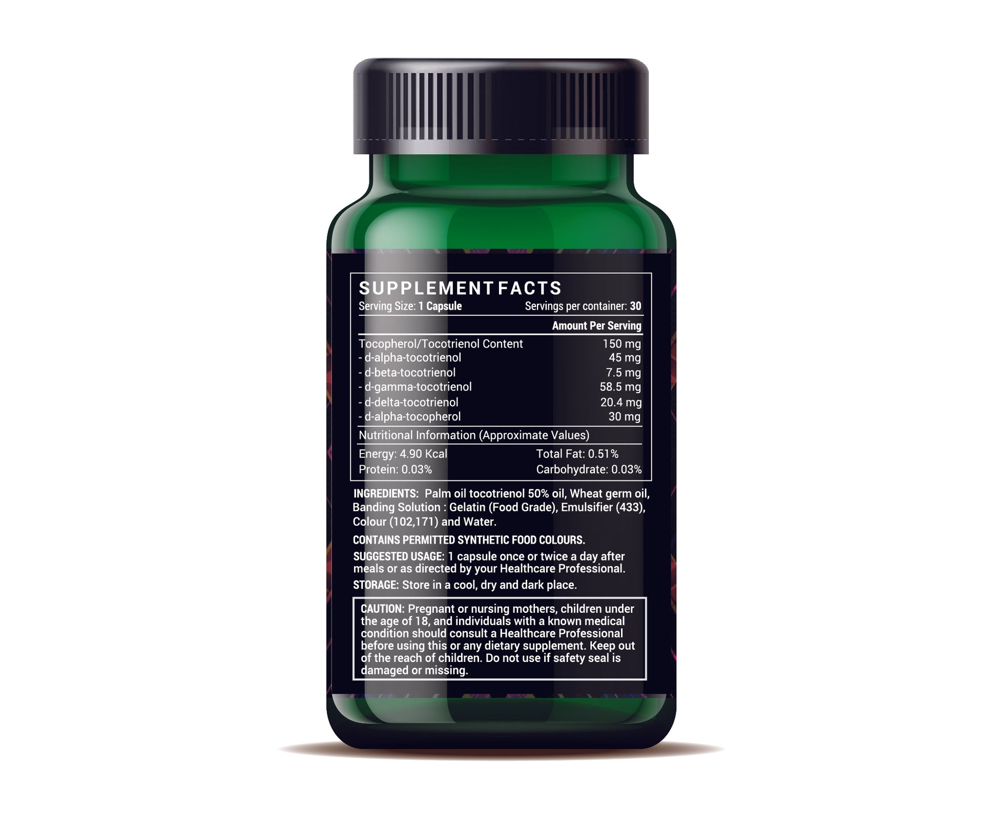 Tocotrienol + Wheat Germ Oil Supplements contains 50% of palm oil. Tocotrienol is extracted from red palm and wheat germ oil derived from the wheat germ.