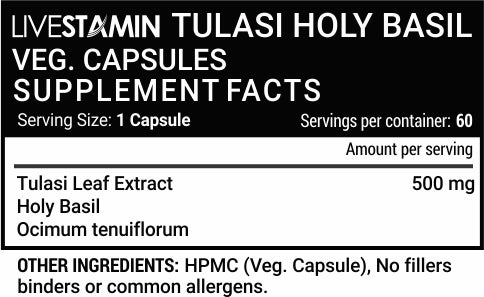 LIVESTAMIN Tulsi (Tulasi) leaf extract holy basil capsules contain 500 mg of pure tulsi leaf extract and each bottle consists of 60 Vegetarian tulsi capsules.